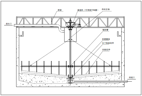 含有細粒物體的料漿或污水,經(jīng)槽架或污泥管給入濃縮池的中心部位,料漿做均勻輻射狀向周邊緩慢流動,在溫游中料漿或污水中的固體顆粒籍自重或絮凝作用而沉降。由于濃度較低,顆?;咀鲎杂谐两?,沉速較快,繼而沉入濃集帶,沉速較慢。沉到下部一沉積帶,也是濃度較高的壓縮區(qū),水分從沉降顆粒的間隙中不斷析出。中耙架連續(xù)回轉(zhuǎn)時,耙齒對該部沉積物沿池底的錐形坡面逐級推向池底的中心處,由該處的排料口排出。中耙齒推進沉積物時,也是刮板對沉積物的一個壓縮過程,這也大大的促使析水作用的加強,因而從排料口排出的沉積物時經(jīng)過濃縮的料漿或污泥。池上部是澄清帶,澄清液從池邊溢流堰排出,從而構(gòu)成濃縮機工作的全過程。