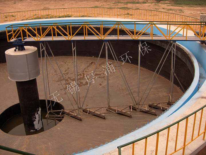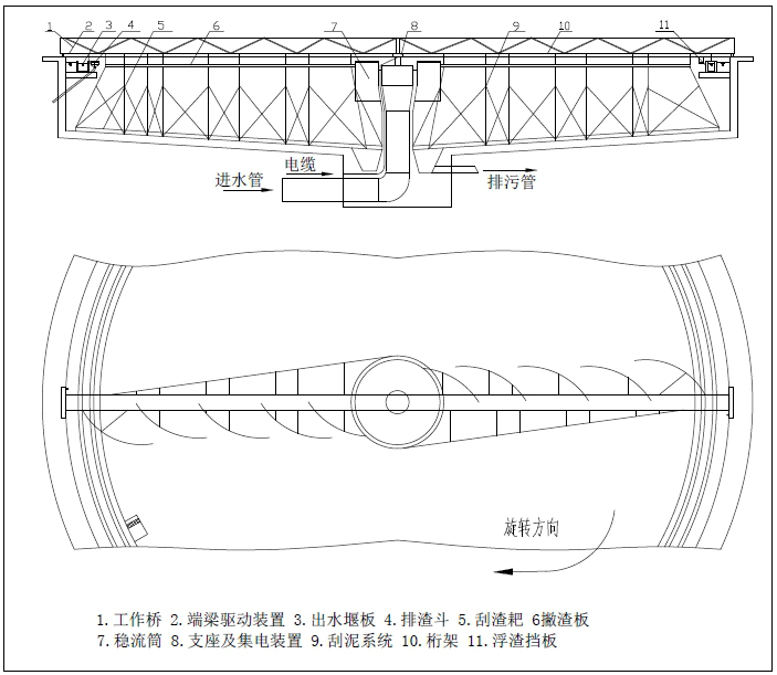 原水從池底經(jīng)中心支墩上不流出,并經(jīng)穩(wěn)流筒配水后,呈輻射狀流向池子周邊集水槽出水,隨著輻向流速的降低,原水中的懸浮物被分離而沉降于池底。工作橋以中心支座為圓心,帶動刮泥、排渣機構,在驅動裝置驅動下將污泥刮集至沉淀池中心集泥槽,依靠水壓或泵排出池外,上部浮渣由刮渣板同步刮至排渣斗排出。