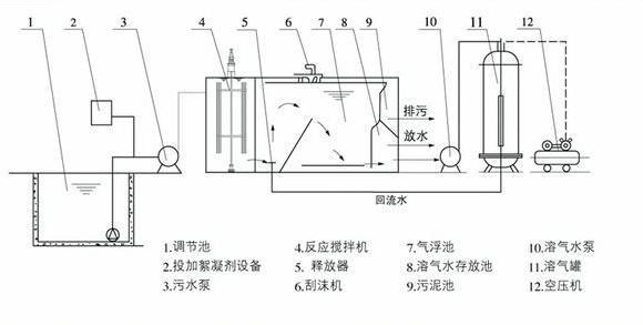 加壓溶氣氣浮在國內外應用廣泛,該法師將原水加壓至0.3~0.4MPA,同時通入空氣,使空氣溶解與水中并達到相應壓力狀態(tài)下的飽和值,然后驟然減至常壓,溶解于水中的空氣以微小氣泡的形式從水中釋放出來,氣泡直徑約為Ø20~Ø100μm左右,目前的基本流程有全部進水加壓溶氣氣浮、部分進水加壓溶氣氣浮、部分處理水回流加壓溶氣氣浮等三種,都是由加壓泵、溶氣罐、釋放器和氣浮池等基本設備組成。