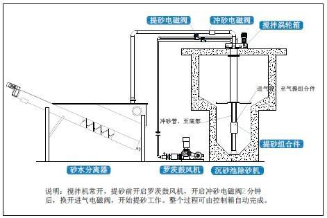 由于葉輪葉漿向上傾斜,旋轉(zhuǎn)時(shí)將使池中的污水呈螺旋狀加速,形成渦流態(tài),產(chǎn)生留心力。同時(shí)池內(nèi)污水流在葉輪葉片攪拌剪切力的作用下,互相剝離,依靠砂的自身重力和旋流的離心力,使砂粒沿池壁呈螺旋線加速沉降,向中心砂斗積聚,經(jīng)氣提或泵提升后排出池外作進(jìn)一步的處理。在此過程中,適當(dāng)?shù)臉~角度和線速度條件,使污水中的砂粒受到?jīng)_刷,并保持好的沉降效果,而原來粘附在砂粒上的有機(jī)物,以及重量小的物質(zhì),隨污水一同流出旋流沉砂池,進(jìn)入后續(xù)工序繼續(xù)處理,砂與少量污水進(jìn)入池外砂水分離器內(nèi),砂經(jīng)分離后外排,污水回流至格柵井。