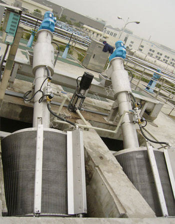 旋轉清污網(wǎng)筒在水中以35°傾角做每分鐘5~8r/min的圓周運動,網(wǎng)筒的1/3浸沒在水中。污水及漂浮物從網(wǎng)筒下口進入網(wǎng)筒內部,漂浮物附著于網(wǎng)筒內壁從水中帶出,當網(wǎng)筒轉到高點,雜質由于重力作用掉入垃圾輸送系統(tǒng),經(jīng)輸送壓榨至出料口。被過濾的污水經(jīng)過網(wǎng)筒間隙流走。